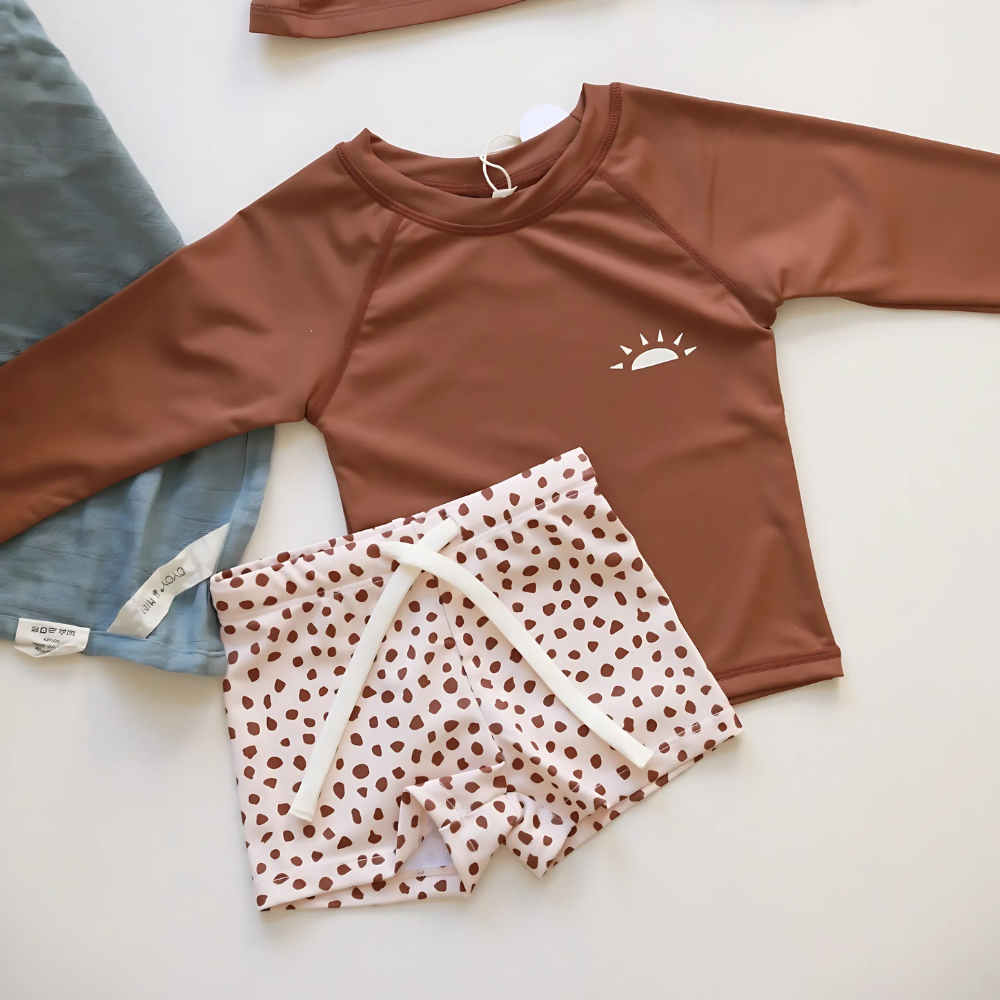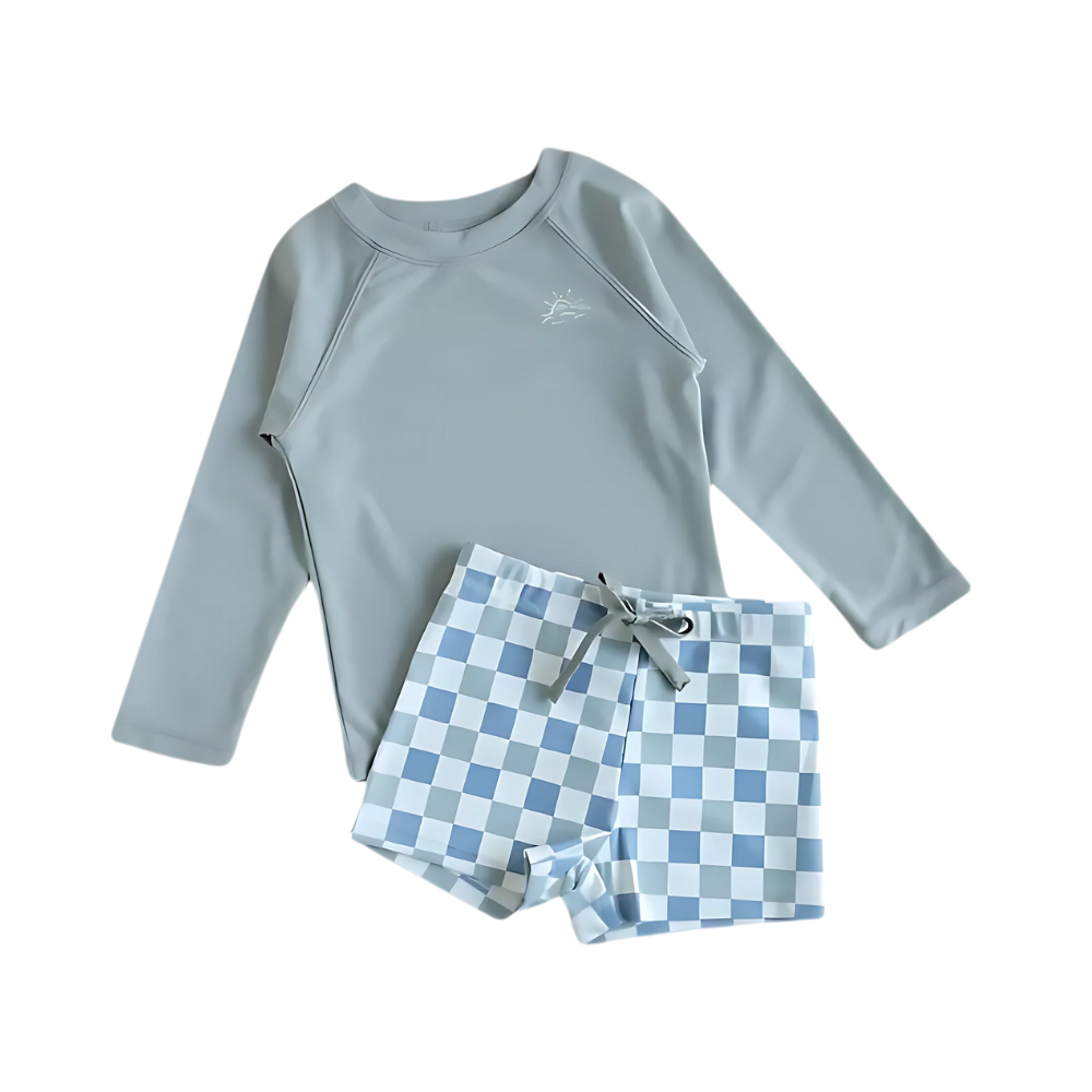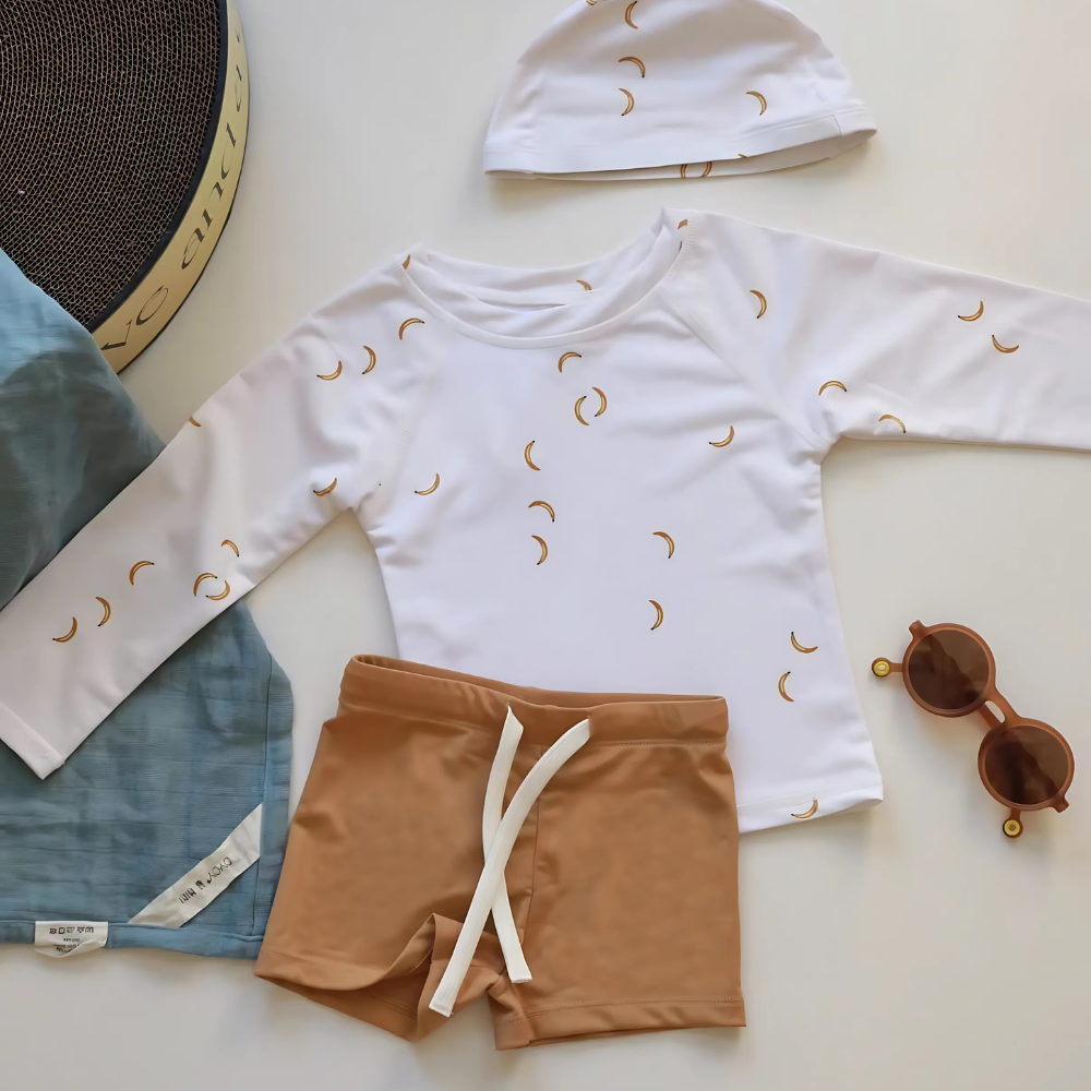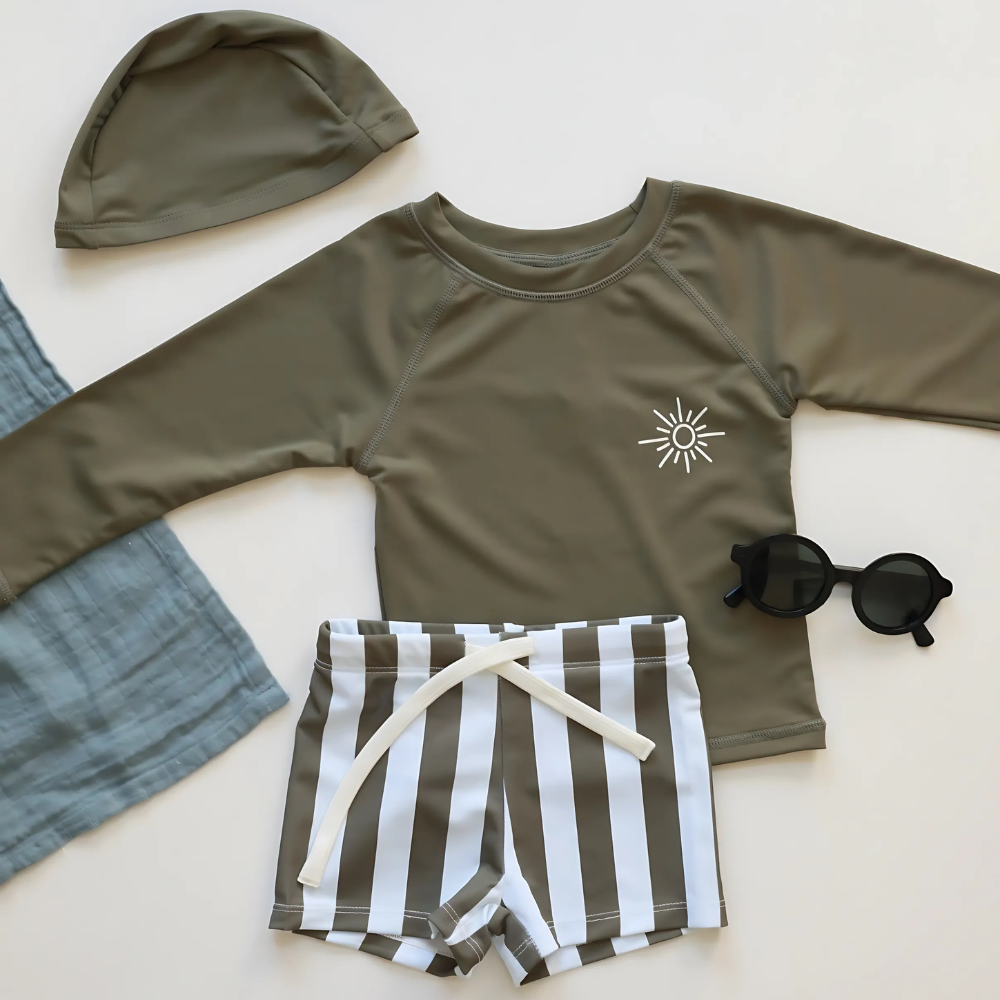 Skydda ditt barn mot solens starka strålar med vårt stilrena och funktionella UV-set – perfekt för stranden, poolen eller trädgårdsleken. Setet innehåller en långärmad tröja, matchande shorts och en liten hatt för extra skydd. Materialet är mjukt, snabbtorkande och har inbyggt solskydd, vilket gör det både bekvämt och säkert för ditt barn att leka i solen.